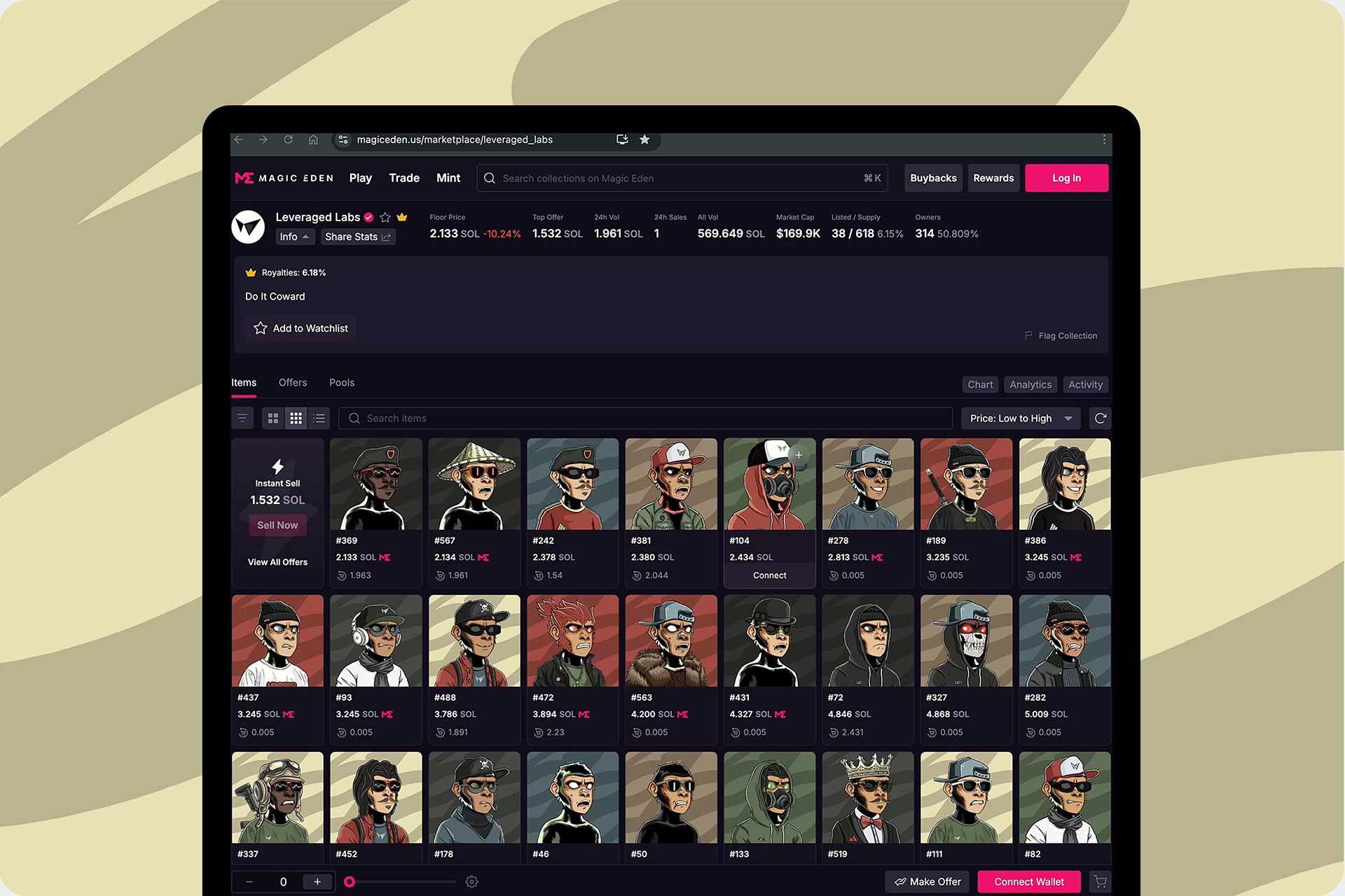 Crucially, I created a subtle '618' graffiti mark that was layered behind every single NFT, acting as a continuous visual anchor linking the collection back to the core Leveraged Labs identity and its Fibonacci roots.